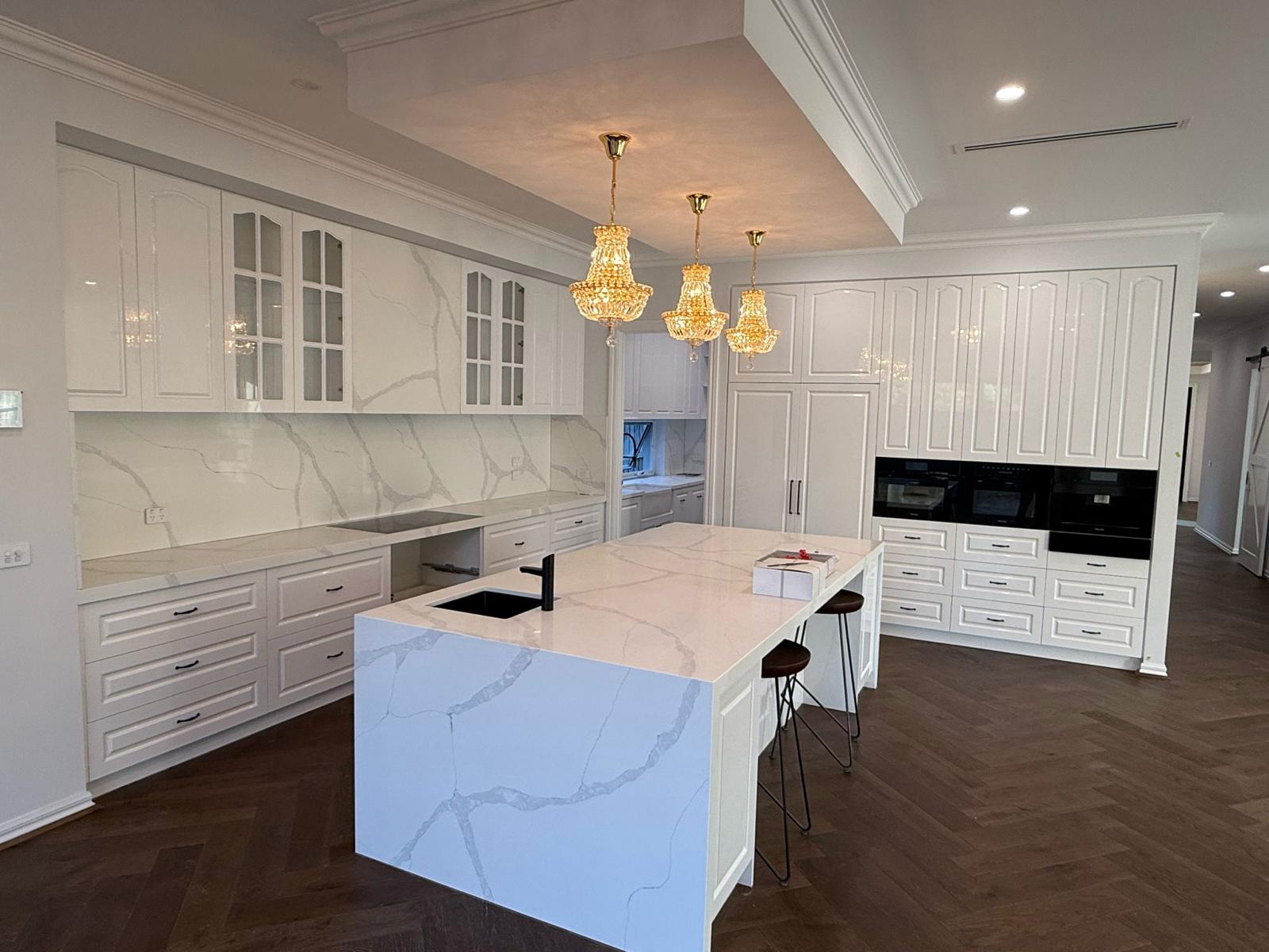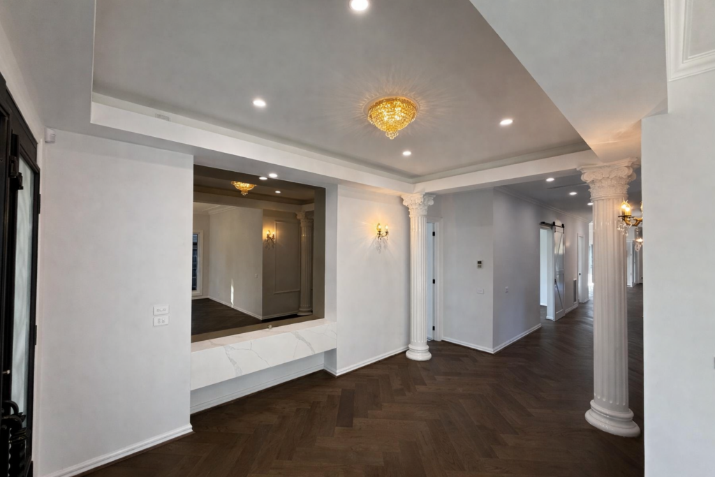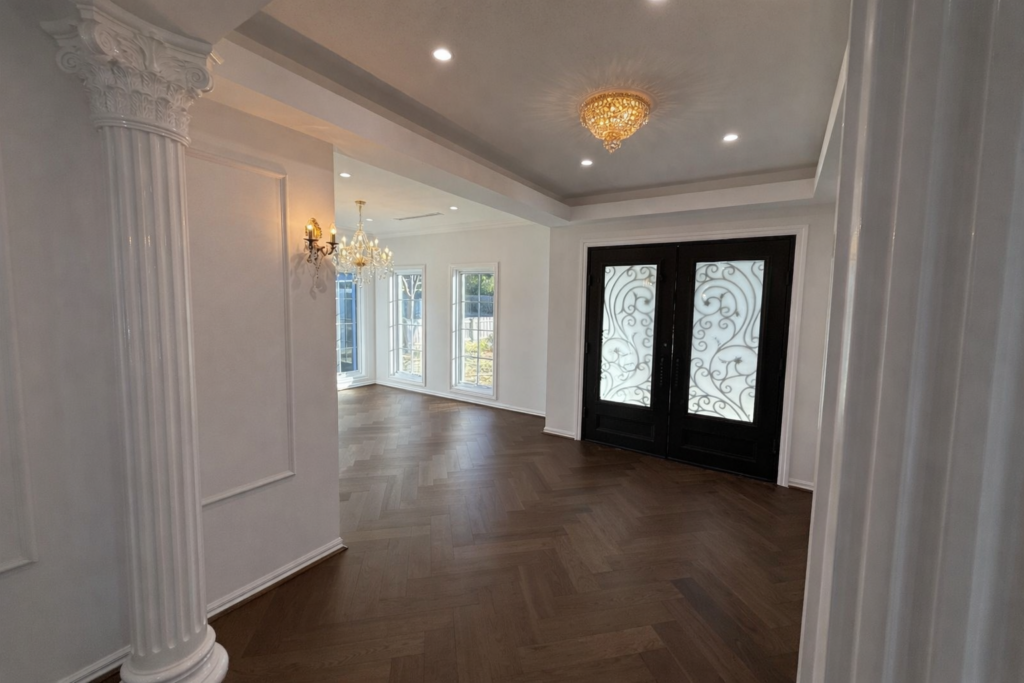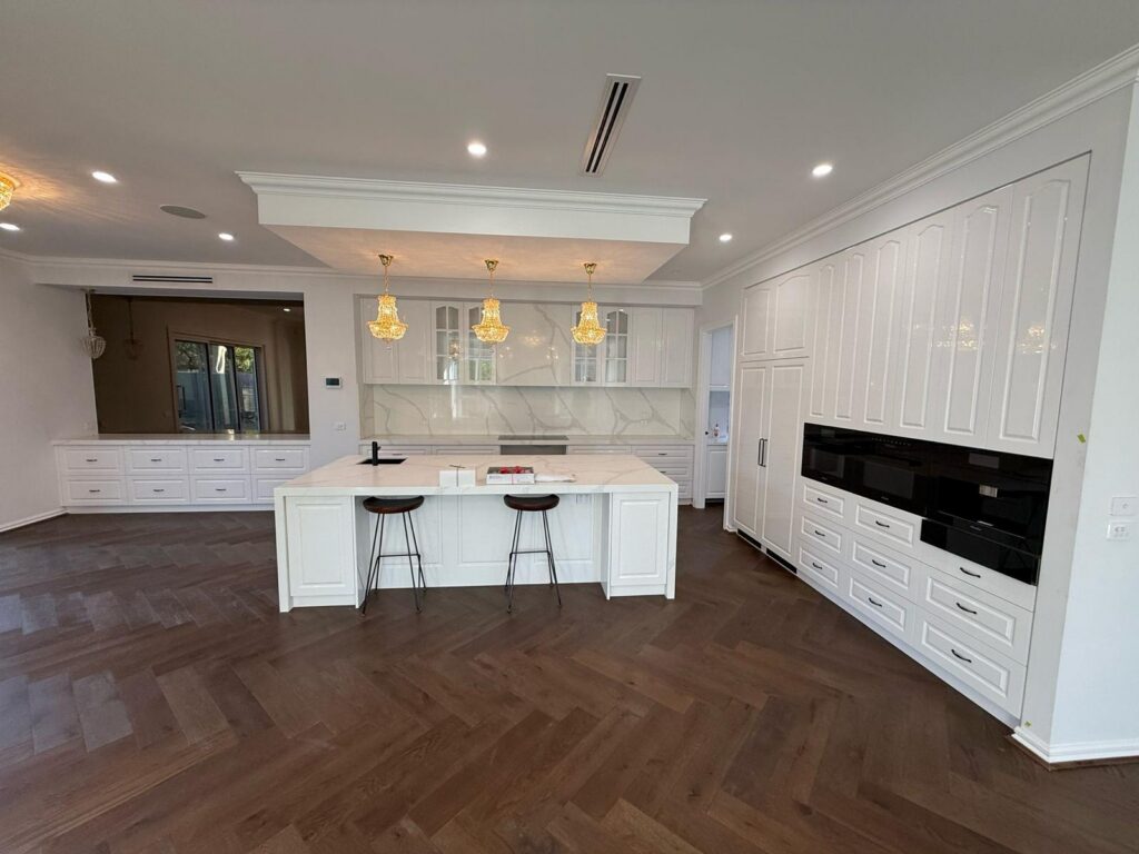 This interior is a graceful composition of modern classic elegance, designed to feel expansive, calm, and quietly luxurious. Rich herringbone timber floors bring warmth and rhythm to the open-plan spaces, while crisp white wall paneling and refined cornices introduce timeless architectural structure. Statement chandeliers and soft recessed lighting add a gentle glow, creating moments of drama without overpowering the serenity of the home.