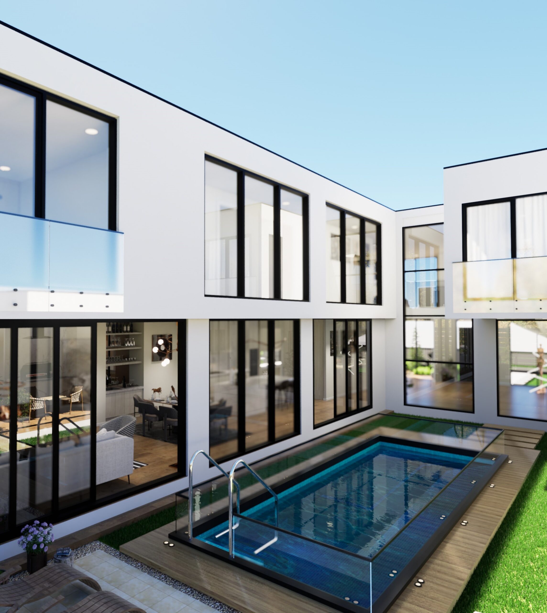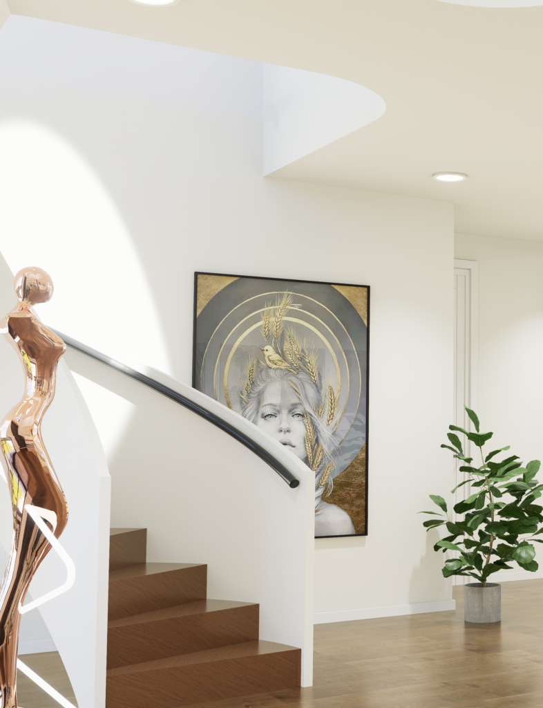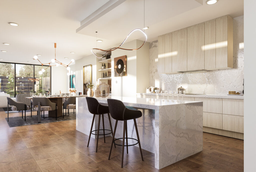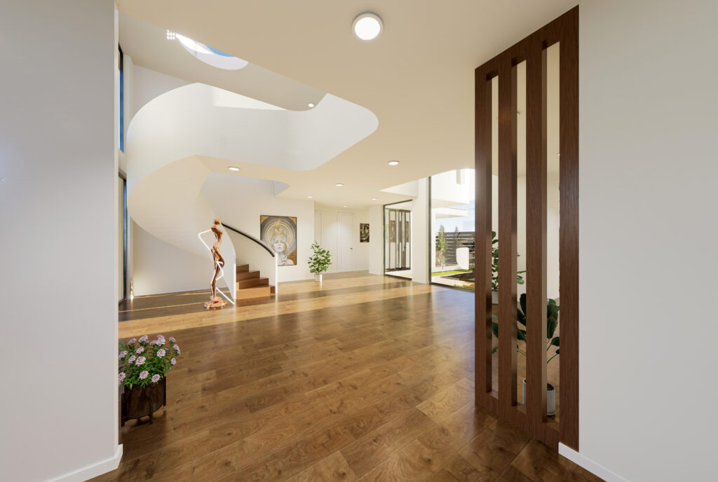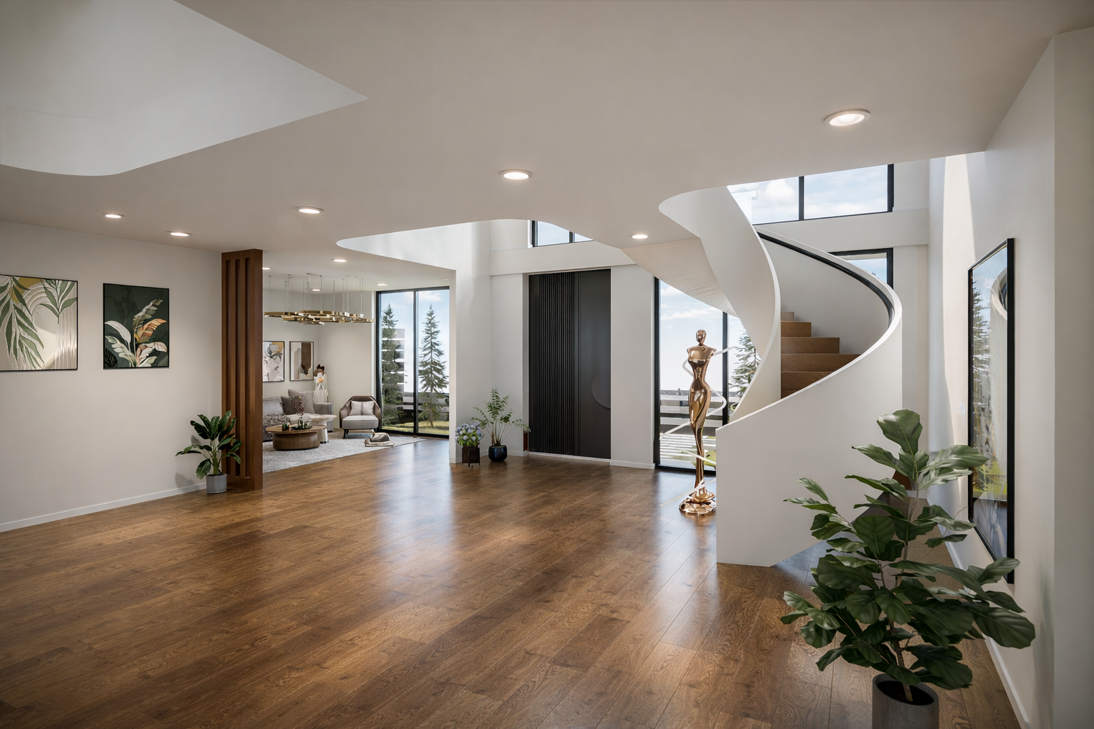 The kitchen and dining area anchor the home with a sleek island, while a sculptural spiral staircase becomes a striking focal point. Layered living spaces, curated details, and double-height volumes create a luxurious yet inviting, light-filled interior.