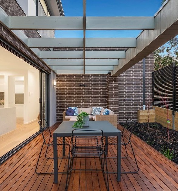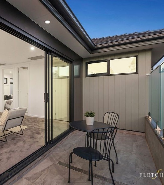 The recessed entry is a key architectural feature—framed by a bold portal and anchored by a warm timber front door that becomes the natural focal point. Slim window openings are carefully positioned to maintain privacy while allowing natural light, reinforcing the home’s modern, considered design.