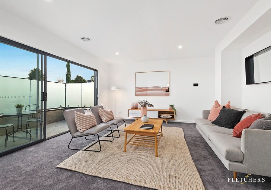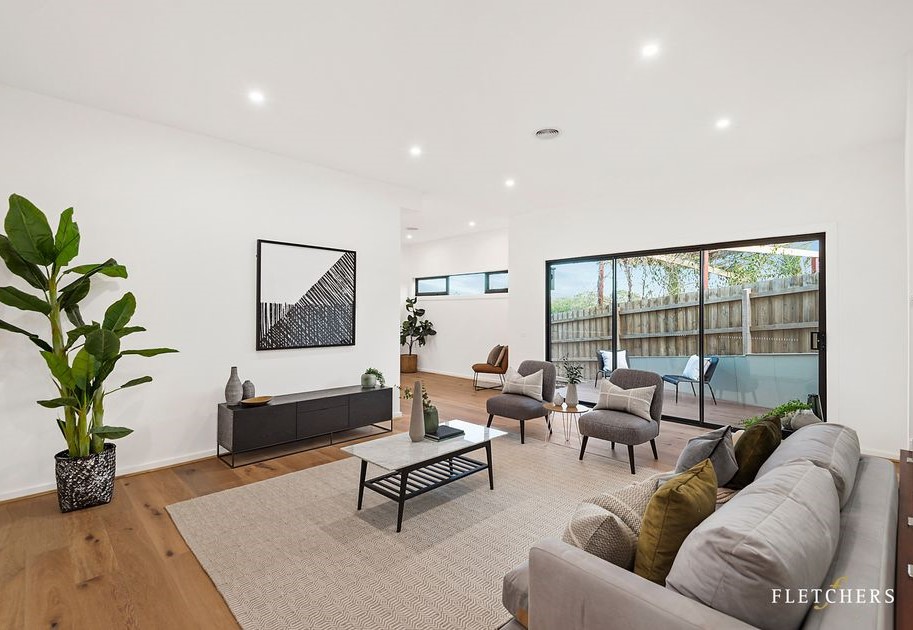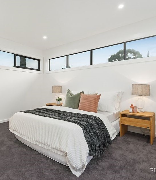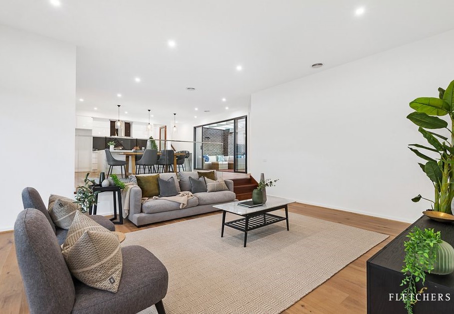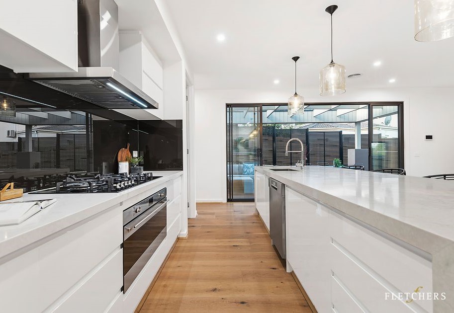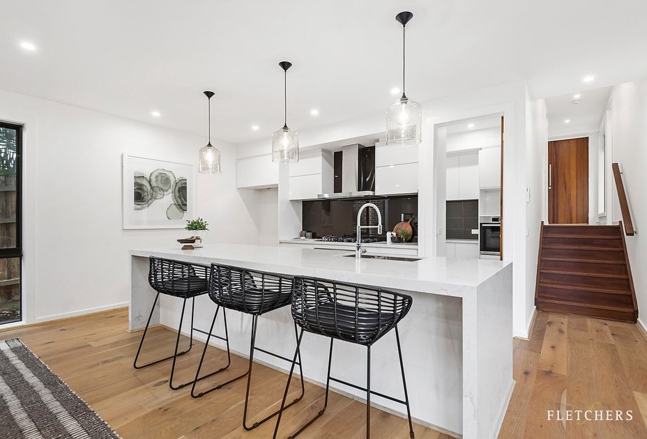 This interior is defined by clean modern lines and functional elegance, designed for everyday living with a refined edge. Bright white surfaces, warm timber floors, and black accents create a crisp yet inviting atmosphere throughout the home.